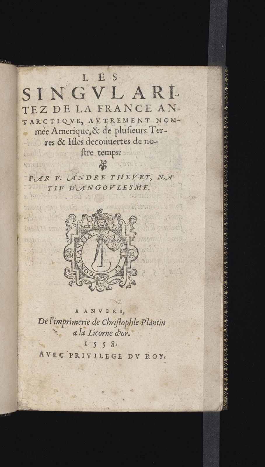 7–48. Christophe Plantin, title page from Les singularitez de la France Antartique, autrement nommée Amerique, & de plusieurs terres & isles decouvertes de nostre temps, by André Thevet