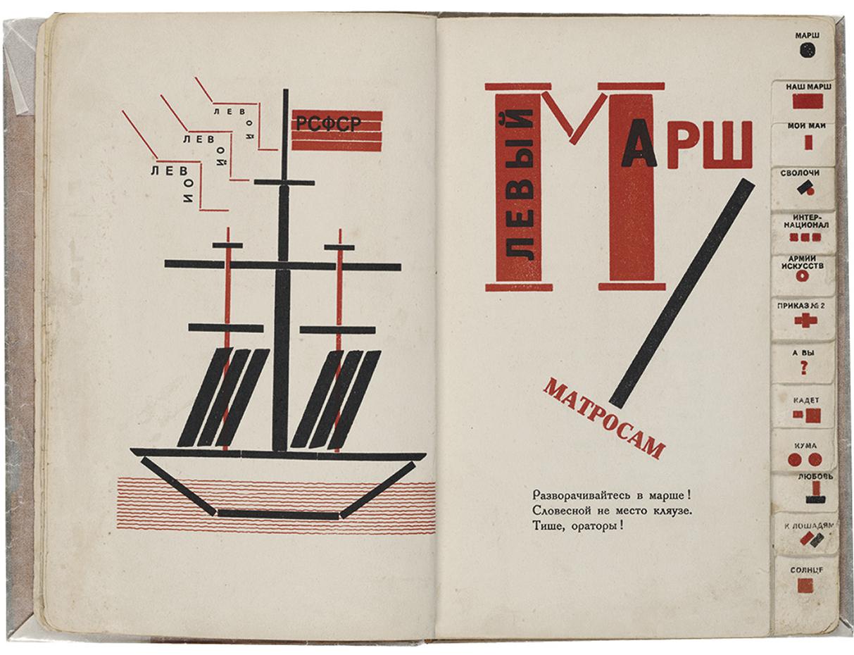 15–15. El Lissitzky, pages from For the Voice showing illustration for the poem “Left March,” by Vladimir Vladimirovich Mayakovski