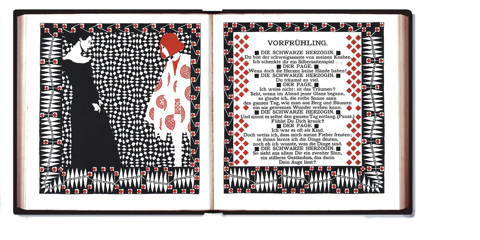 12–15. Koloman Moser, illustration of a duchess and a page for Rainer Maria Rilke’s poem “Vorfrühling” (Early Spring) from Ver Sacrum