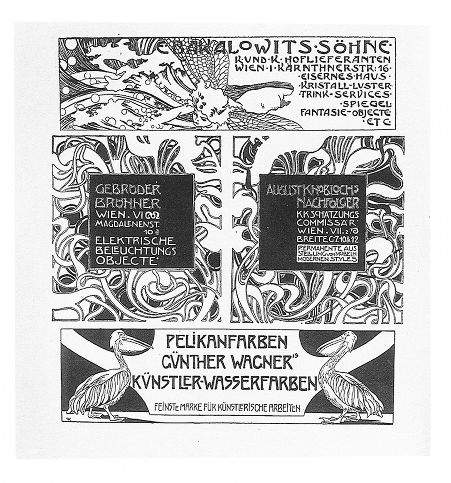12–14. Alfred Roller, Koloman Moser, and Frederick Koenig, inside front cover advertisements for Ver Sacrum