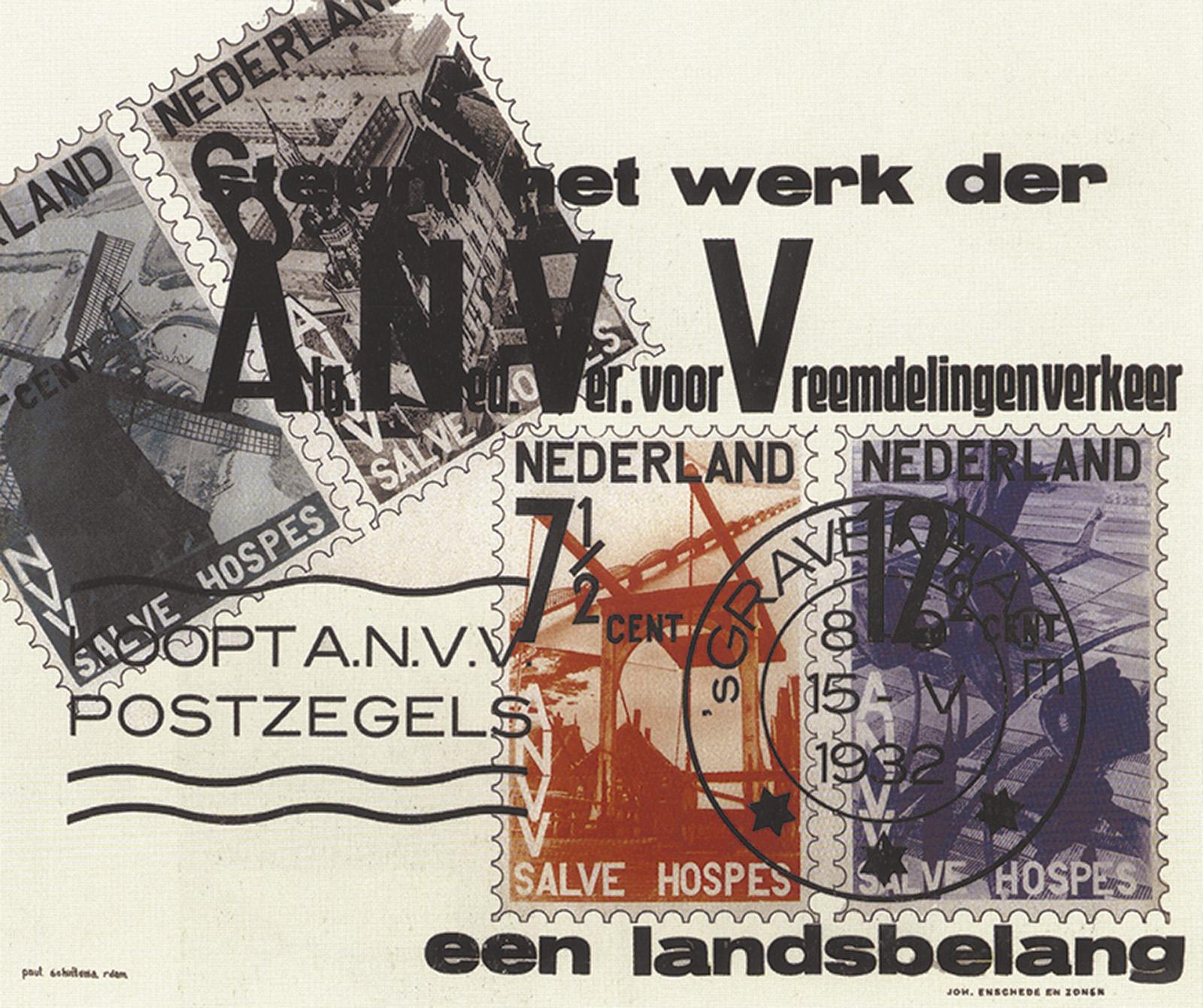 16–55. Paul Schuitema, “Koopt A.N.V.V. Postzegels, Steunt het werk der Alg. Ned. Ver. Voor Vreemdelingen verkeer, een landsbelang,” poster