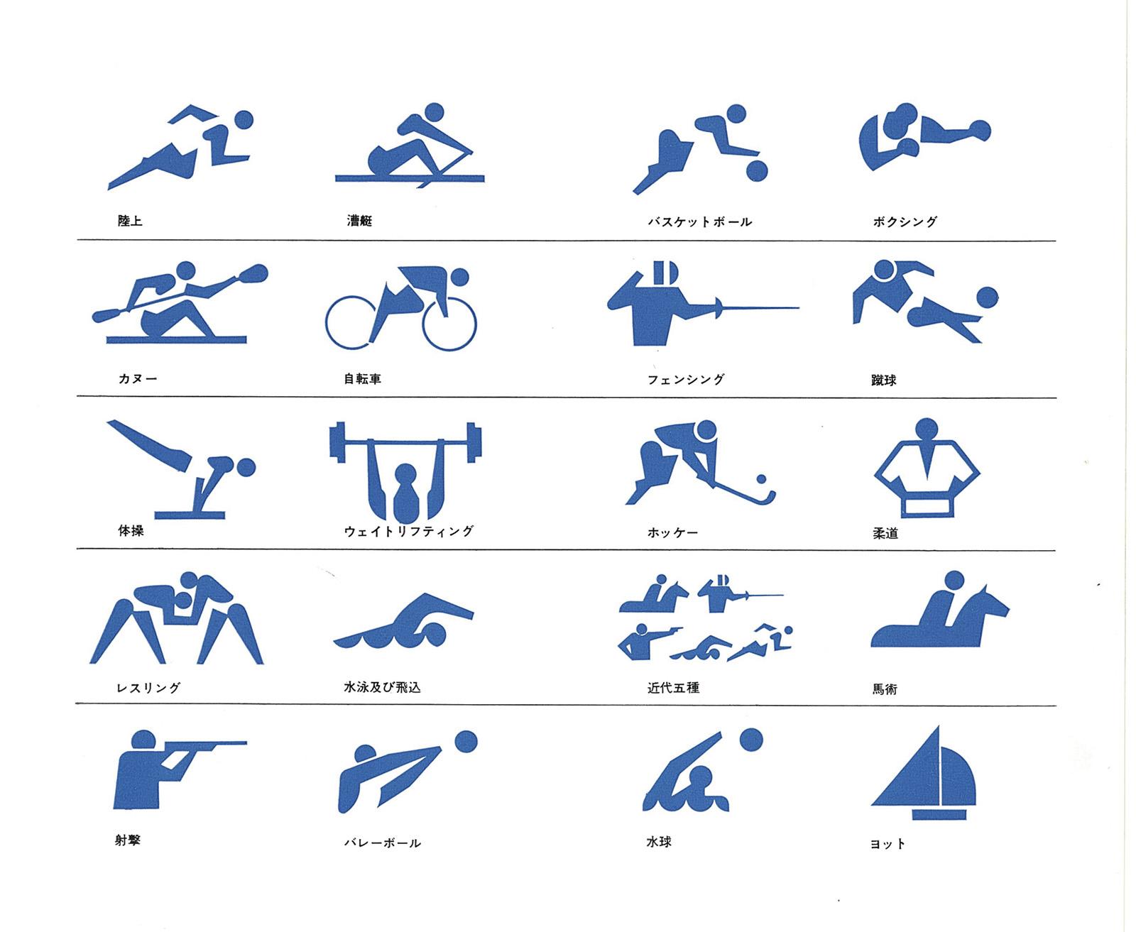 20–44. Masaru Katzumie (art director), Yusaku Kamekura (designer), and their staff, twenty comprehensive multisport symbols for the Tokyo Olympiad