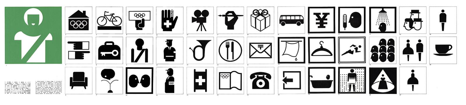 20–45. Masaru Katzumie (art director), Yusaku Kamekura (designer), and their staff, thirty-nine general information pictograms for the Tokyo Olympiad