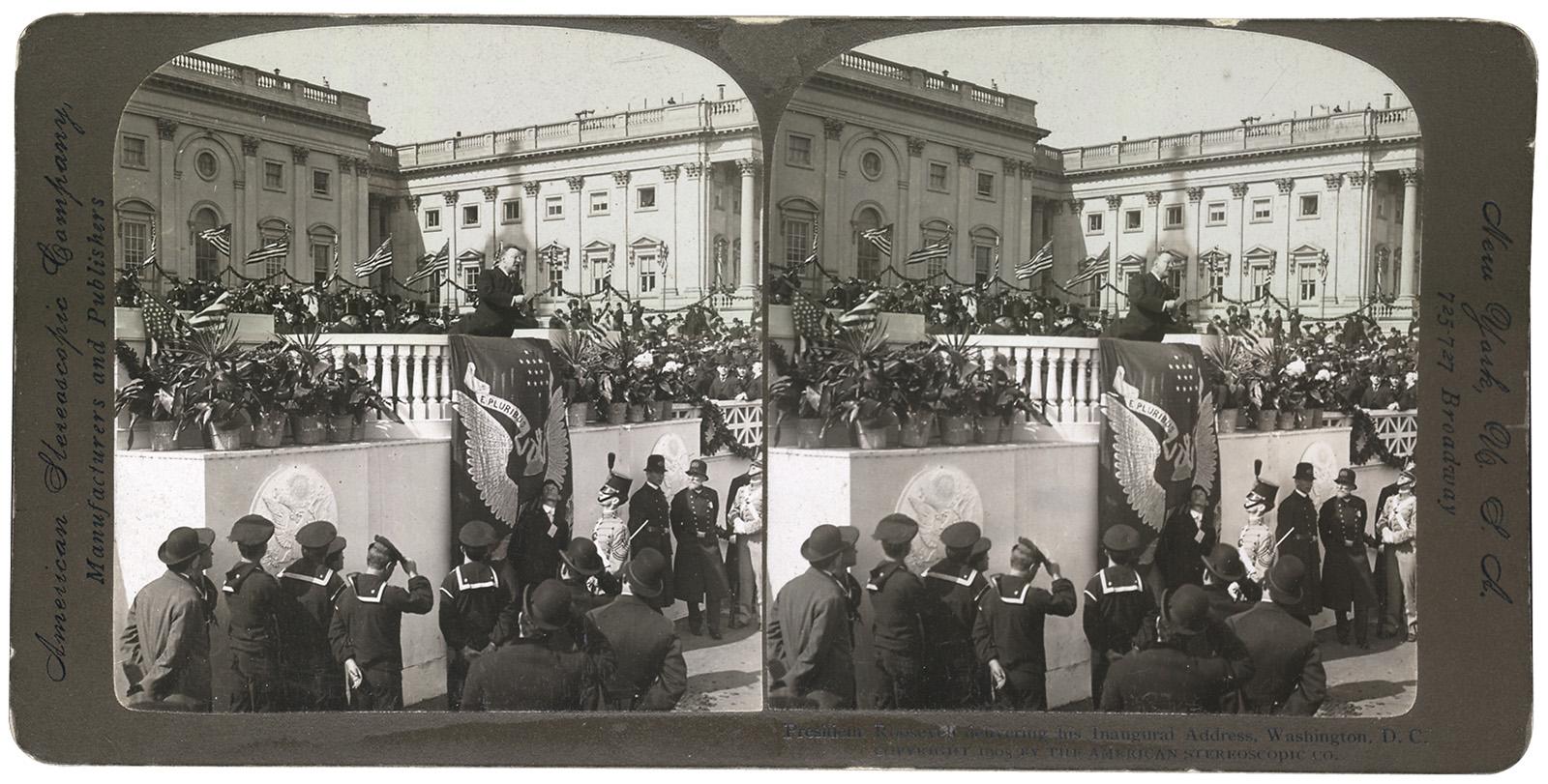 9–45. Stereocard depicting President Theodore Roosevelt delivering his inaugural address