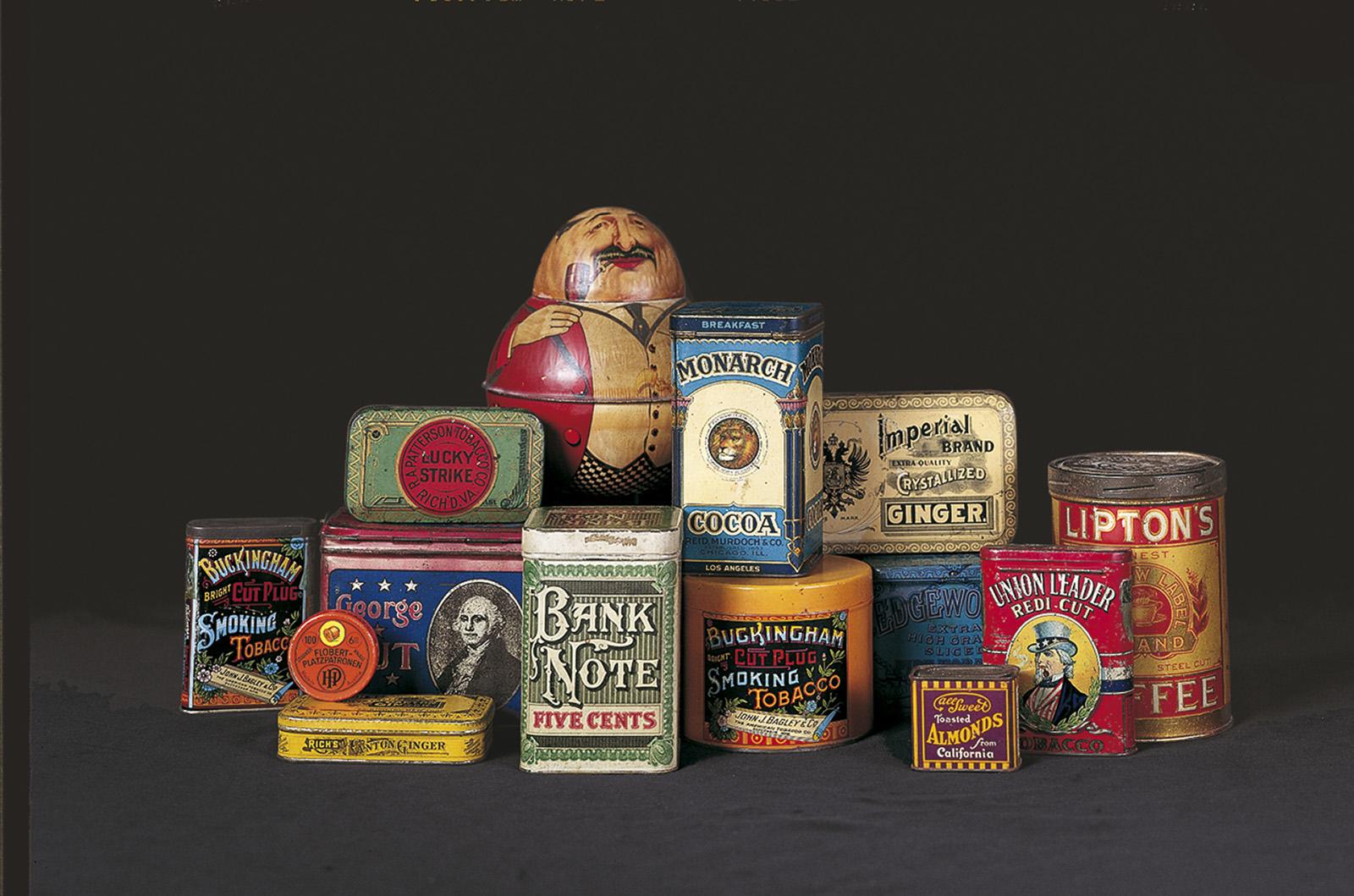 9–60. Package designs chromolithographed on tin for food and tobacco products used bright flat colors, elaborate lettering, and iconic images to create an emblematic presence for the product.